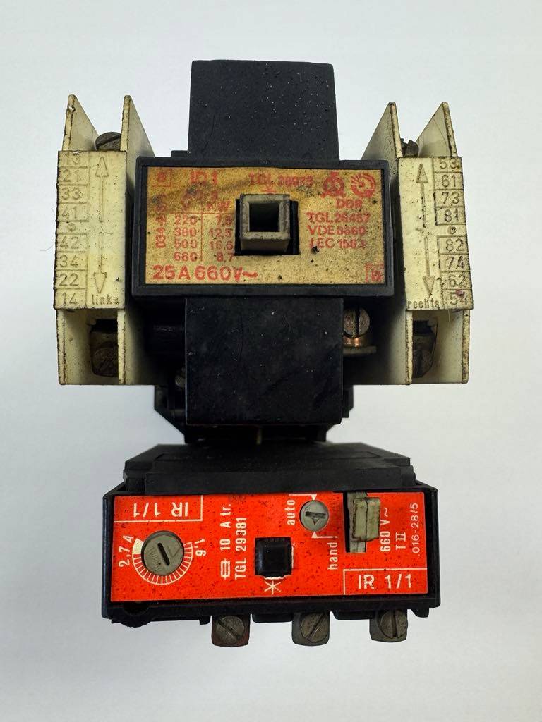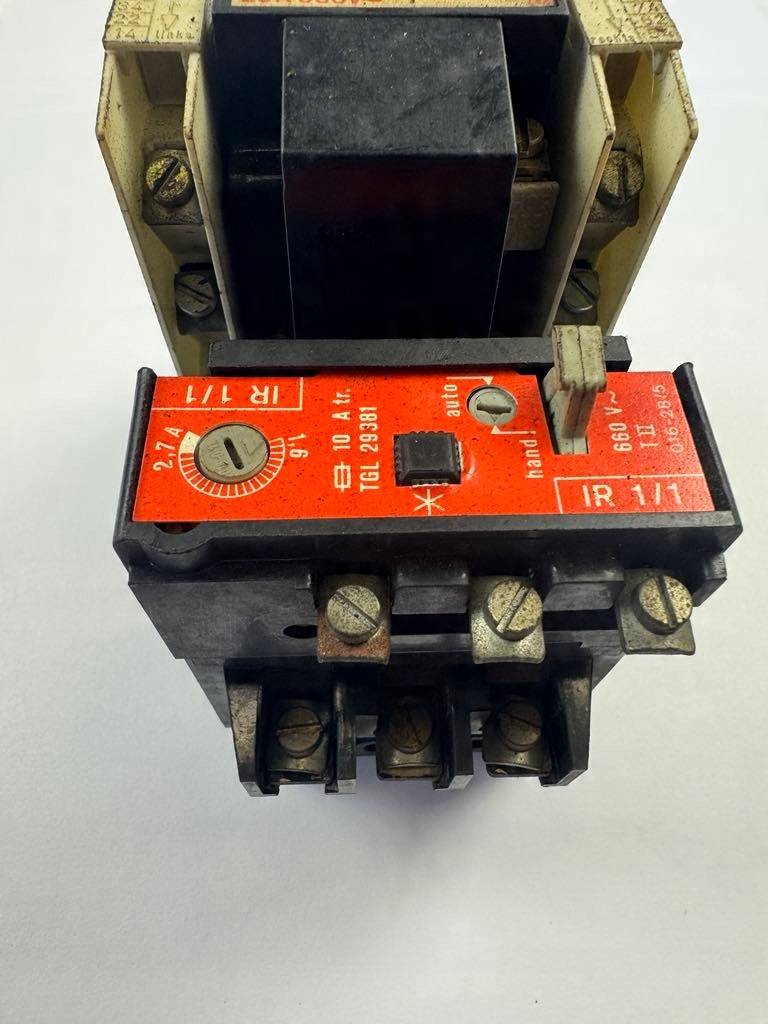 Stycznik ID‑1 to standardowy, trójfazowy aparat produkcji DDR, wykorzystywany do sterowania obciążeniami elektrycznymi. W zestawie z termikiem IR 1/1 zapewnia zabezpieczenie przed przeciążeniem. Solidna konstrukcja i uniwersalne parametry czynią go odpowiednim do montażu w szafach sterowniczych.